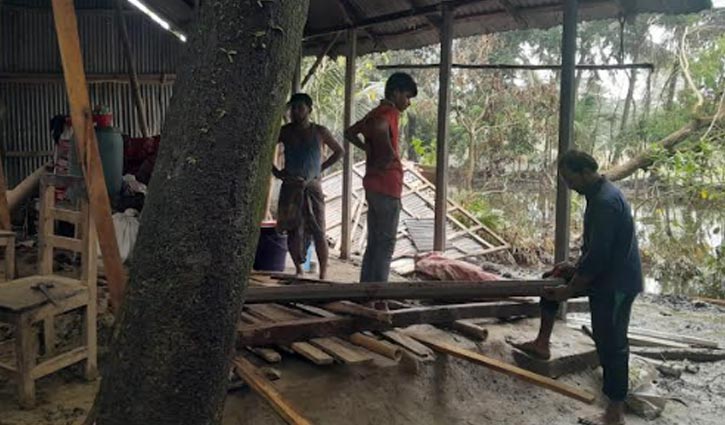 ভেঙে যাওয়া ঘর মেরামতের কাজ করছে কয়েকজন শ্রমিক