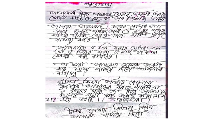 গতকাল মঙ্গলবার (৮ অক্টোবর) উপজেলার রোজী মোজাম্মেল কলেজের সংলগ্ন এলাকায় তিন ব্যক্তির বাড়ির গেটে এই চিঠি রেখে যায় চক্রটি। আতঙ্কিত হয়ে পড়েছেন চিঠি পাওয়া পরিবারগুলো।