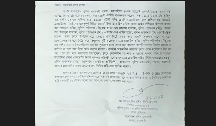 নোটিসে আরও বলা হয়, পাঠদান চলাকালে এই এসআইয়ের ক্লাসে কোন মনোযোগ ছিল না এবং পাশাপাশি বসে কথা বলছিলেন। এ জন্য একজন প্রশিক্ষক প্রয়োজনীয় ব্যবস্থা নিতে একাডেমির অধ্যক্ষের কাছে লিখিত প্রতিবেদন দাখিল করেছেন। তাই বিধি অনুযায়ী কেন তাকে চলমান মৌলিক প্রশিক্ষণ হতে অব্যাহতি প্রদান করা হবে না, তা কৈফিয়ত তলবনামা প্রাপ্তির পরবর্তী তিন দিনের মধ্যে দাখিলের জন্য নির্দেশ দেওয়া হয় ওই এসআইকে।