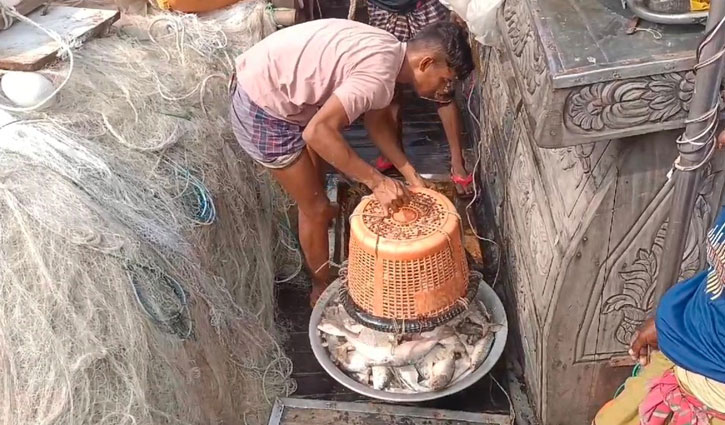 জেলের জালে ধরা পড়ছে ঝাঁকে ঝাঁকে ইলিশ
