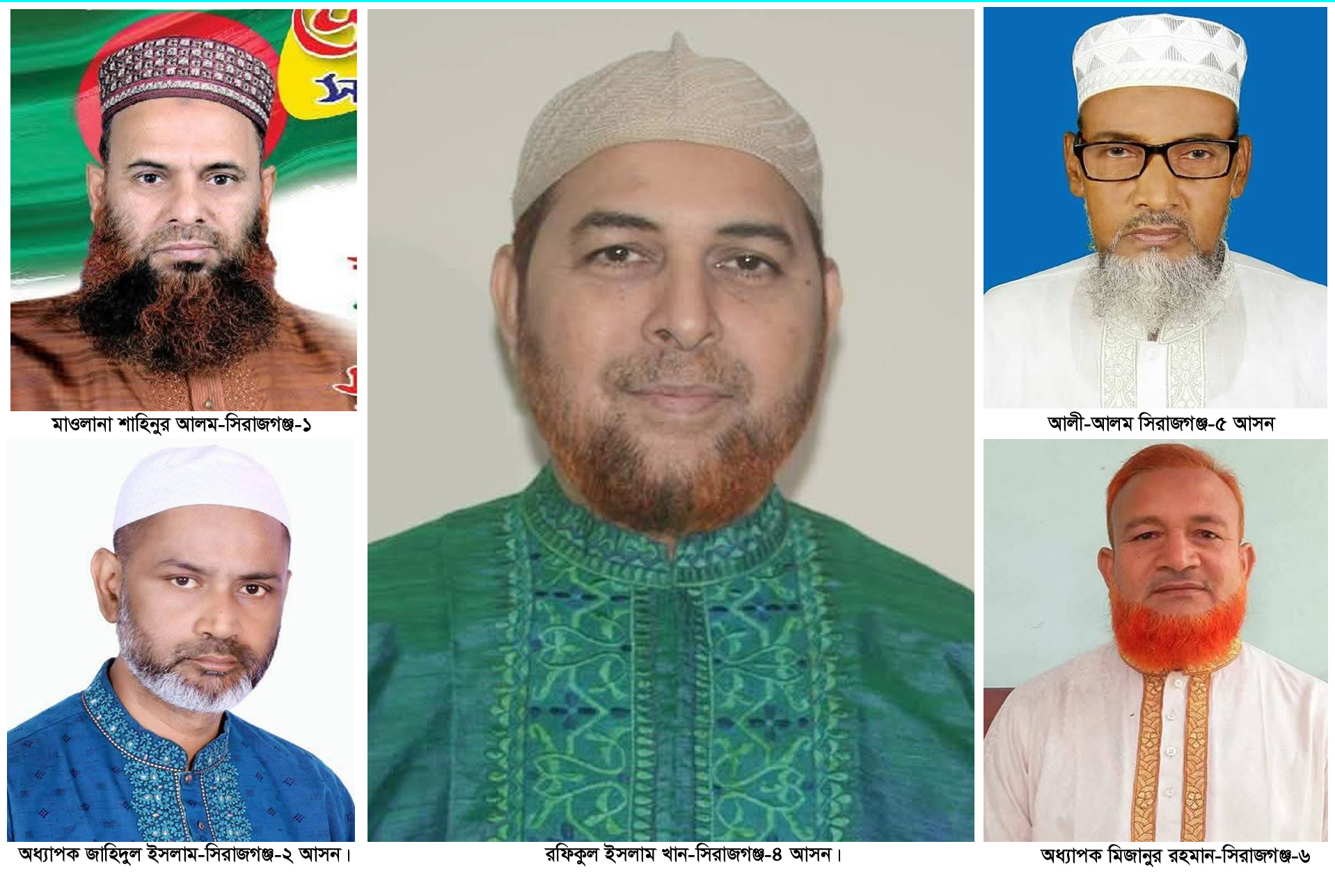 সিরাজগঞ্জ-১ (কাজীপুর-সদরের একাংশ) আসনে জেলা জামায়াতের আমির মাওলানা শাহীনুর আলম, সিরাজগঞ্জ-২ (সদর-কামারখন্দ) আসনে জেলা জামায়াতের সেক্রেটারি অধ্যাপক জাহিদুল ইসলাম, সিরাজগঞ্জ-৪ (উল্লাপাড়া) আসনে কেন্দ্রীয় সহকারী সেক্রেটারি জেনারেল মাওলানা রফিকুল ইসলাম খান; সিরাজগঞ্জ-৫ (বেলকুচি-চৌহালী) আসনে জেলা নায়েবে আমির অধ্যক্ষ আলী আলম ও সিরাজগঞ্জ-৬ (শাহজাদপুর) আসনে উপজেলা আমির অধ্যাপক মিজানুর রহমান।