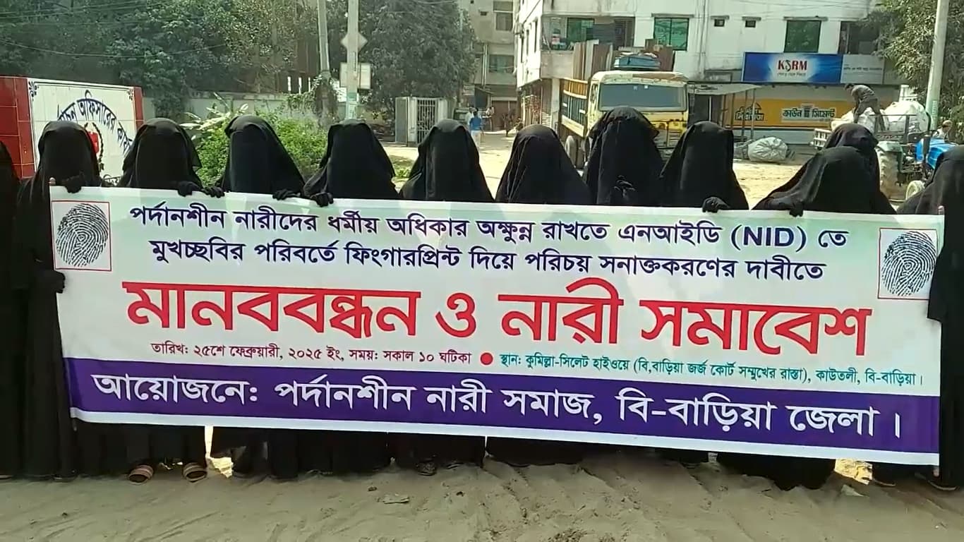 ফিঙ্গারপ্রিন্ট নিয়ে পরিচয় যাচাইসহ এনআইডি কার্ড প্রদানের দাবিতে ব্রাহ্মণবাড়িয়ায় মানববন্ধন করেছেন পর্দানশীন নারীরা। এ ছাড়া তারা জেলা নির্বাচন কর্মকর্তা ও জেলা শিক্ষা কর্মকর্তার কাছে স্মারকলিপিও প্রদান করে।