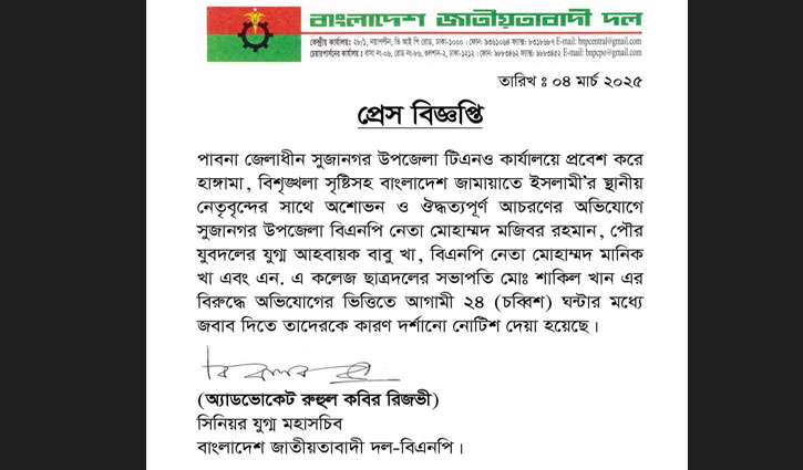 শোকজ নোটিশে বলা হয়েছে, “পাবনা জেলাধীন সুজানগর উপজেলা ইউএনওর কার্যালয়ে প্রবেশ করে হাঙ্গামা, বিশৃঙ্খলা সৃষ্টিসহ বাংলাদেশ জামায়াতে ইসলামীর স্থানীয় নেতৃবৃন্দের সঙ্গে অশোভন ও ঔদ্ধত্যপূর্ণ আচরণের অভিযোগে সুজানগর উপজেলা বিএনপি নেতা মোহাম্মদ মজিবর রহমান, পৌর যুবদলের যুগ্ম আহ্বায়ক বাবু খা, বিএনপি নেতা মোহাম্মদ মানিক খা এবং সুজানগর এন. এ কলেজ ছাত্রদলের সভাপতি মো. শাকিল খানের বিরুদ্ধে অভিযোগের ভিত্তিতে আগামী ২৪ (চব্বিশ) ঘন্টার মধ্যে জবাব দিতে তাদেরকে কারণ দর্শানো নোটিশ দেওয়া হয়েছে।”