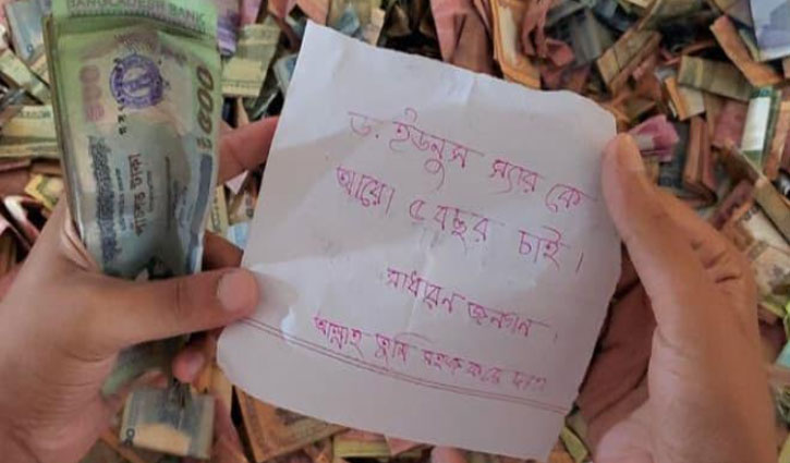 কিশোরগঞ্জের ঐতিহাসিক পাগলা মসজিদের দানবাক্সে টাকার সঙ্গে মনোবাসনা পূরণের কিছু চিঠি-চিরকুট পাওয়া গেছে। এর মধ্যে দুইটি চিরকুট সামাজিক যোগাযোগমাধ্যম ফেসবুকে ভাইরাল হয়েছে।