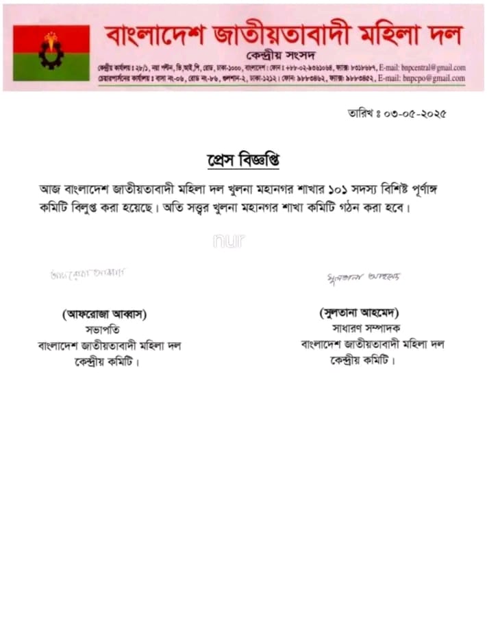 খুলনা মহানগর জাতীয়তাবাদী মহিলা দলের কমিটি বিলুপ্ত ঘোষণা করা হয়েছে।