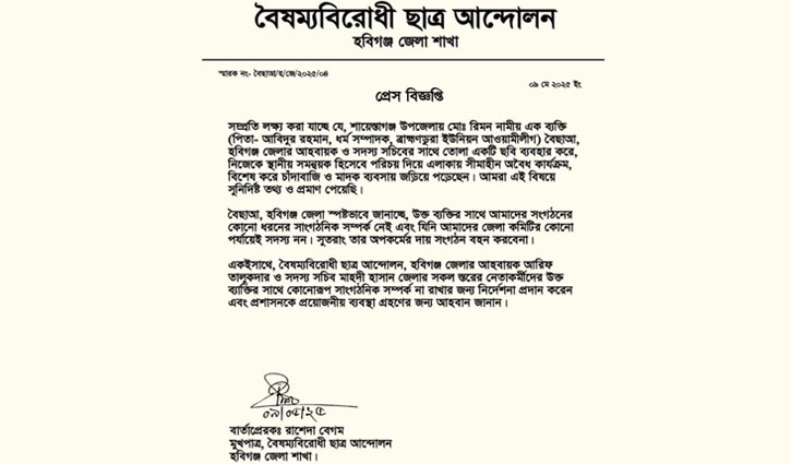 বৈষম্যবিরোধী ছাত্র আন্দোলন হবিগঞ্জ জেলা শাখার মুখপাত্র রাশেদা বেগম স্বাক্ষরিত বিজ্ঞপ্তিতে বলা হয়েছে, সম্প্রতি লক্ষ্য করা যাচ্ছে, রিমন নামের এক যুবক বৈষম্যবিরোধী ছাত্র আন্দোলন হবিগঞ্জ জেলার আহ্বায়ক ও সদস্যসচিবের সঙ্গে তোলা একটি ছবি ব্যবহার করে নিজেকে সমন্বয়ক পরিচয়ে এলাকায় সীমাহীন অবৈধ কার্যক্রম করছেন। বিশেষ করে চাঁদাবাজি ও মাদক ব্যবসায় জড়িয়ে পড়েছেন। এই বিষয়ে সুনির্দিষ্ট তথ্য ও প্রমাণ পাওয়া গেছে। রিমনের সঙ্গে আমাদের সংগঠনের কোনো সম্পর্ক নেই। এমনকি তিনি জেলা কমিটির কোনো পর্যায়ের সদস্যও নন। সুতরাং তার অপকর্মের দায় সংগঠন বহন করবে না।