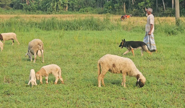 ওই গ্রামের খোলা মাঠে সকালে সূর্য ওঠার সঙ্গে সঙ্গে মাঠজুড়ে দেখা মিলবে এক ব্যতিক্রম দৃশ্যের। সারি সারি ভেড়া আর ছাগল ঘুরে বেড়াচ্ছে সবুজ ঘাসের মধ্যে। আর এদের নিরাপত্তার দায়িত্ব পালন করছে এক বিদেশি প্রজাতির কুকুর-জার্মান শেফার্ড।