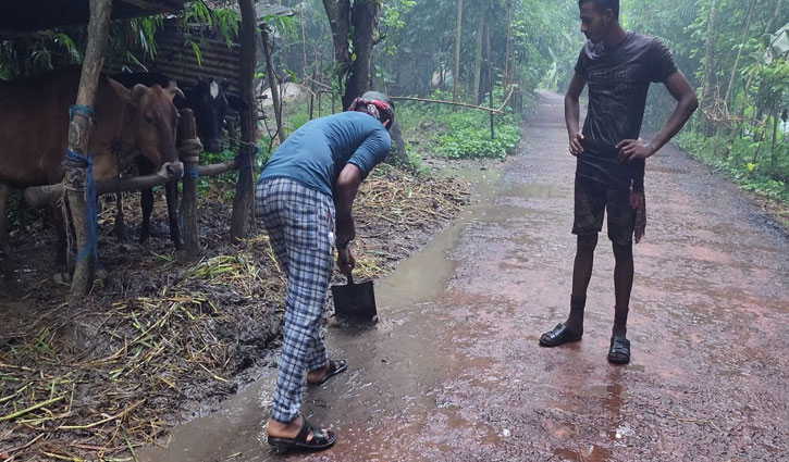 রবিবার সকাল ৭টা বেজে ২০ মিনিটে গিয়ে দেখা যায়, আধা ঘণ্টা আগে শুরু হওয়া বৃষ্টির মধ্যেই চলছে সড়কে পিচ ঢালাইয়ের কাজ। শ্রমিকরা বৃষ্টিতে ভিজে কাজ চালু রেখেছেন। সড়কের পাশে জমে থাকা বৃষ্টির পানি বেলচার সাহায্যে সরিয়ে নিতে দেখা যায় তাদের। এরপর সেই স্থানেই পিচ দিচ্ছিলেন তারা।