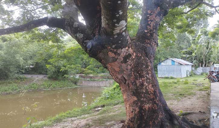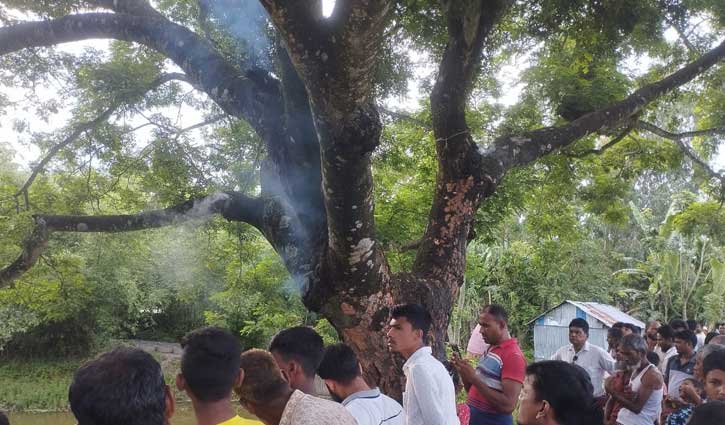 কড়াই গাছের ভেতরে আগুন জ্বলছে, উৎসুক জনতার ভিড়