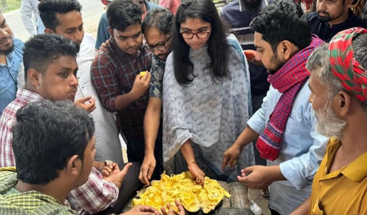 গাছের কাঁঠাল পেড়ে এনসিপি নেতাকর্মীদের আপ্যায়ন করছেন এক কৃষক।