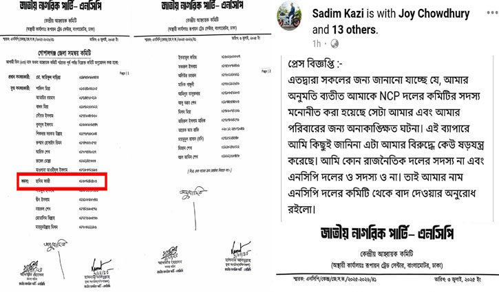 এনসিপি ঘোষিত কমিটি (বাঁয়ে)। ছাদিম কাজীর ফেসবুক পোস্ট (ডানে)