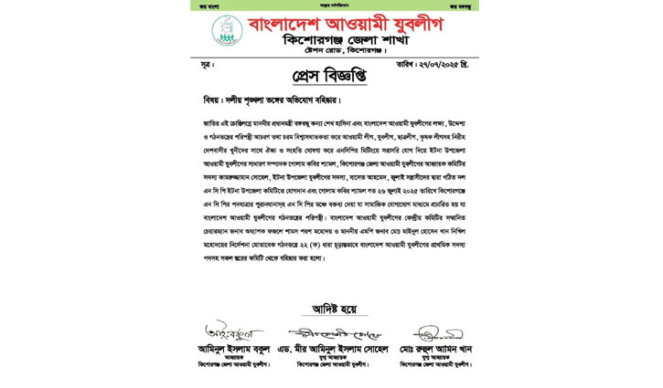 রবিবার (২৭ জুলাই) জেলা যুবলীগের আহ্বায়ক আমিনুল ইসলাম বকুল, যুগ্ম আহ্বায়ক মীর আমিনুল ইসলাম সোহেল ও মো. রুহুল আমিন খান স্বাক্ষরিত এক প্রেস বিজ্ঞপ্তিতে বিষয়টি জানানো হয়েছে।