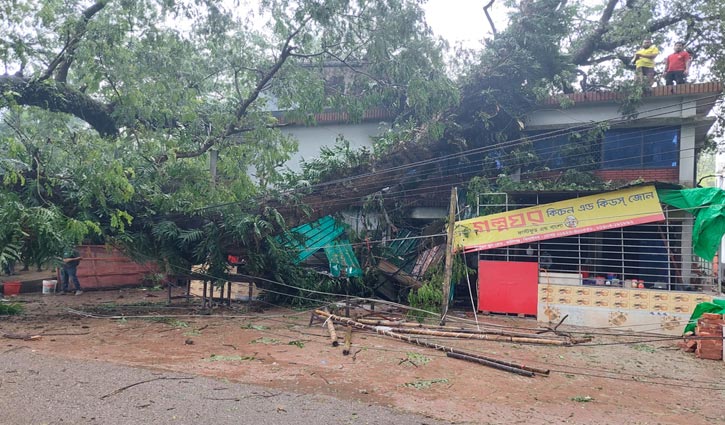 ঝিনাইদহের কালীগঞ্জ শহরের সরকারি ভূষণ স্কুল সড়কে থাকা শতবর্ষী একটি কড়াই গাছ উপড়ে দুইতলা ভবনের ওপর পড়েছে। এ সময় আহত হয়েছেন ভবনটি নিচে থাকা গল্পঘর নামে রেস্টুরেন্টের একজন কর্মী।