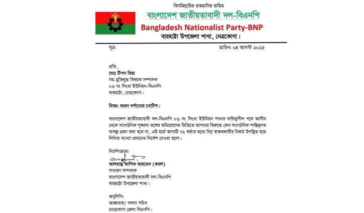 বারহাট্টা উপজেলা বিএনপির সাধারণ সম্পাদক আশিক আহমেদ কমল স্বাক্ষরিত ওই নোটিশে বলা হয়েছে, ‘‘বাংলাদেশ জাতীয়তাবাদী দল-বিএনপি ৬ নম্বর সিংধা ইউনিয়ন শাখার দায়িত্বশীল পদে আসীন থেকে সাংগঠনিক শৃঙ্খলা ভঙ্গের অভিযোগের ভিত্তিতে আপনার বিরুদ্ধে কেন সাংগঠনিক শাস্তিমূলক ব্যবস্থা গ্রহণ করা হবে না, এই মর্মে আগামী ৭২ ঘণ্টার মধ্যে নিম্ন স্বাক্ষরকারীর নিকট উপস্থিত হয়ে লিখিত ব্যাখ্যা প্রদানের নির্দেশ দেওয়া হলো।’’