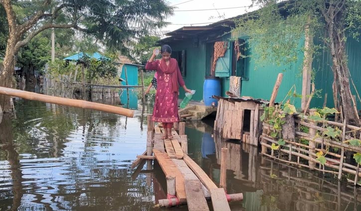 পানিতে তলিয়ে যাওয়া সড়ক দিয়ে সন্তানকে নিয়ে বাড়ি ফিরছেন এক মা