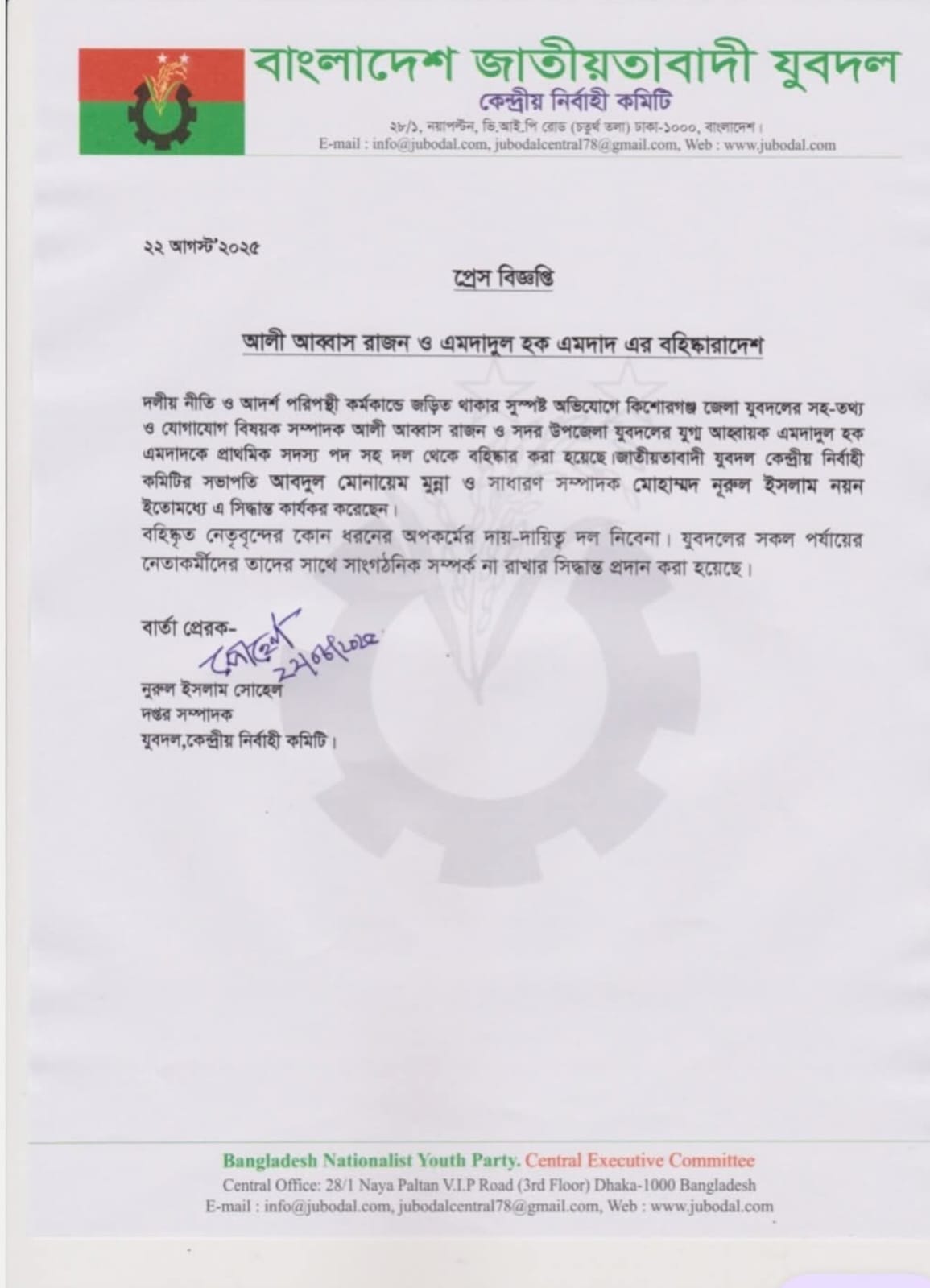 কিশোরগঞ্জে বহিষ্কৃত দুই যুবদল নেতা