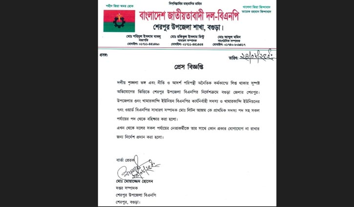বগুড়ায় ধর্ষণ চেষ্টার অভিযোগ, বিএনপি নেতাকে বহিষ্কার