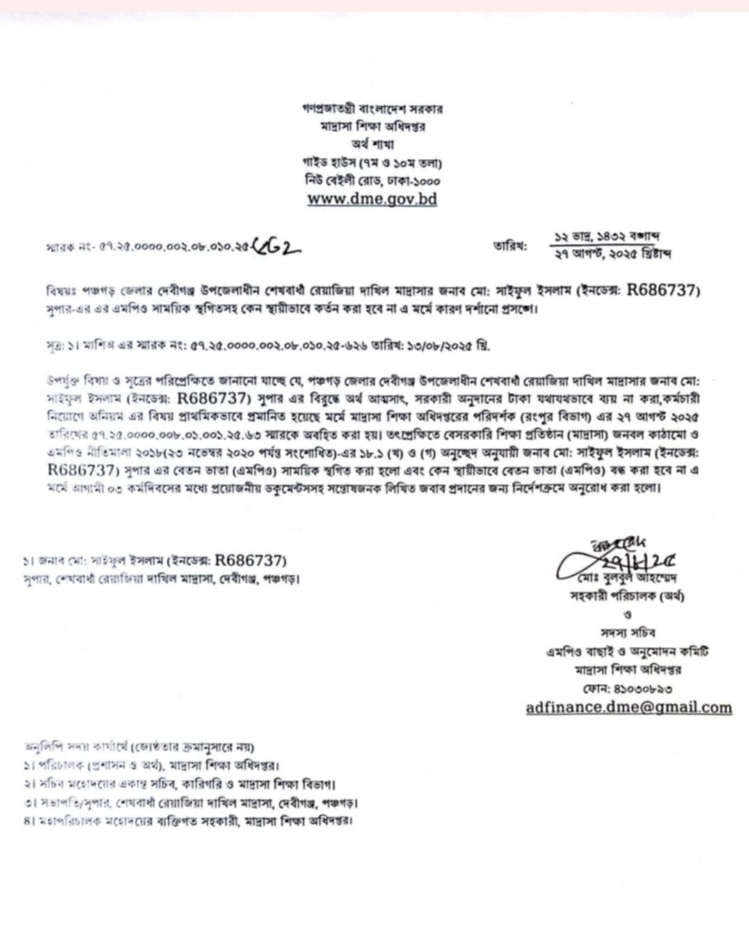 আর্থিক অনিয়মের অভিযোগে পঞ্চগড়ের দেবীগঞ্জ উপজেলার শেখবাঁধা রেয়াজিয়া দাখিল মাদরাসার সুপার মো. সাইফুল ইসলামের বেতন-ভাতা (এমপিও) সাময়িকভাবে স্থগিত করা হয়েছে।