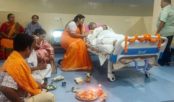 দুর্ঘটনায় আহত বর আনন্দ সাহার হাত-পা ব্যান্ডেজে বাঁধা অবস্থায় থাকলেও নির্ধারিত লগ্ন ভ্রষ্ট না করতে পরিবার ও হাসপাতাল কর্তৃপক্ষের সহায়তায় বিয়ের আয়োজন হয়।
