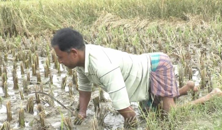 সামেদুল ইসলাম নিজের কৃষি জমিতে ধান কাটছেন