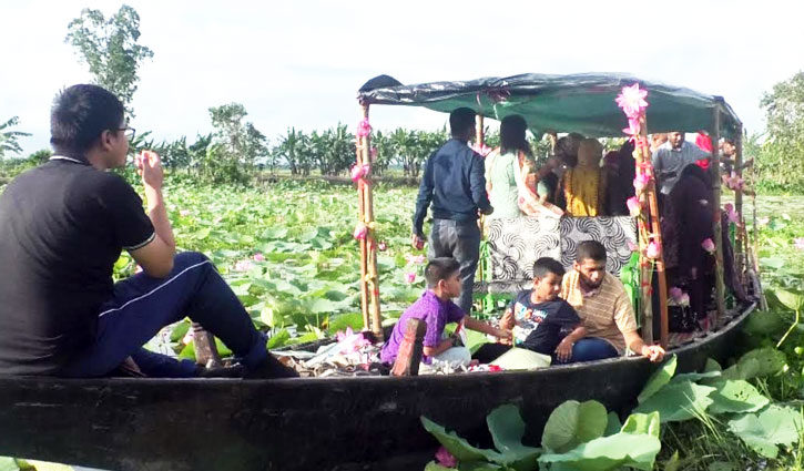 বিলভর্তি পদ্ম ফুলের সৌন্দর্য উপভোগ করতে এসেছেন দর্শনার্থীরা।