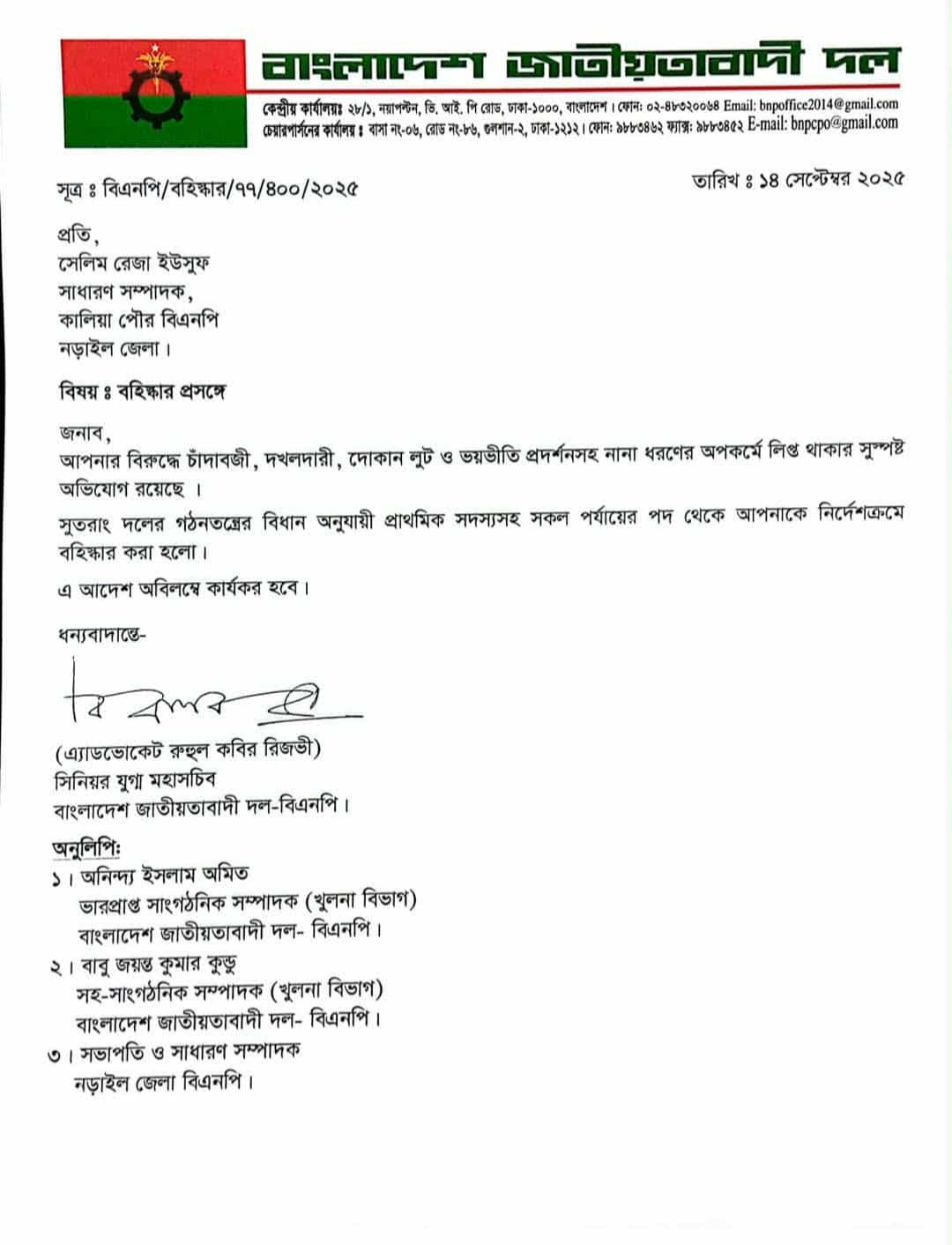 চিঠিতে বলা হয়, “আপনার বিরুদ্ধে চাঁদাবাজি, দখলদারী, দোকান লুট ও ভয়ভীতি প্রদর্শনসহ নানা ধরনের অপকর্মে লিপ্ত থাকার সুস্পষ্ট অভিযোগ রয়েছে। সুতরাং, দলের গঠনতন্ত্রের বিধান অনুযায়ী প্রাথমিক সব পর্যায়ে পদ থেকে আপনাকে নির্দেশক্রমে বহিষ্কার করা হলো।”