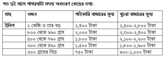পাইকারি এই বাজারের ব্যবসায়ী সুলতান মিয়া বলেন, “জেলেদের জালে ইলিশ কম ধরা পড়ায় মাছের দাম বেশি।”