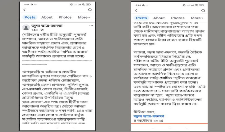 শনিবার (৪ অক্টোবর) সকালে তাদের ফেসবুক পেইজে দেওয়া এক বিবৃতিতে এ অবরোধ প্রত্যাহারের ঘোষণা দেয় জুম্ম ছাত্র-জনতা।