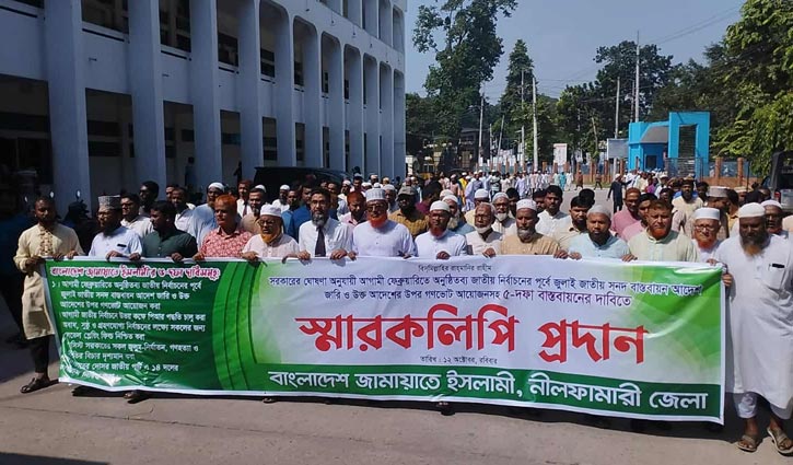 নীলফামারী: সকাল সাড়ে ১০টার দিকে জেলা জামায়াতের কার্যালয় থেকে মিছিল বের হয়ে জেলা প্রশাসক কার্যালয়ের সামনে গিয়ে শেষ হয়। জামায়াত নেতারা জেলা প্রশাসক মোহাম্মদ নায়িরুজ্জামানের মাধ্যমে অন্তর্বর্তীকালীর সরকারের প্রধান উপদেষ্টা বরাবর স্মারকলিপি দেন।