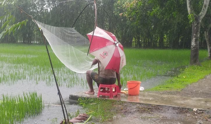 ধান ক্ষেতে জমে থাকা পানিতে মাছ ধরছেন এক ব্যক্তি