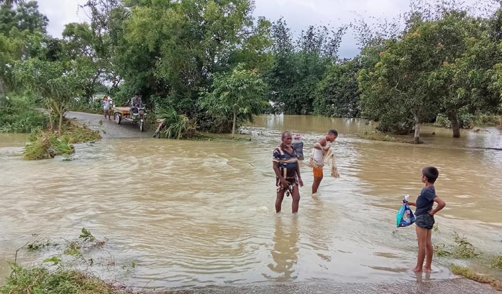 দুই পাশের জমি প্লাবিত করে বৃষ্টির পানি সড়কে উঠেছে
