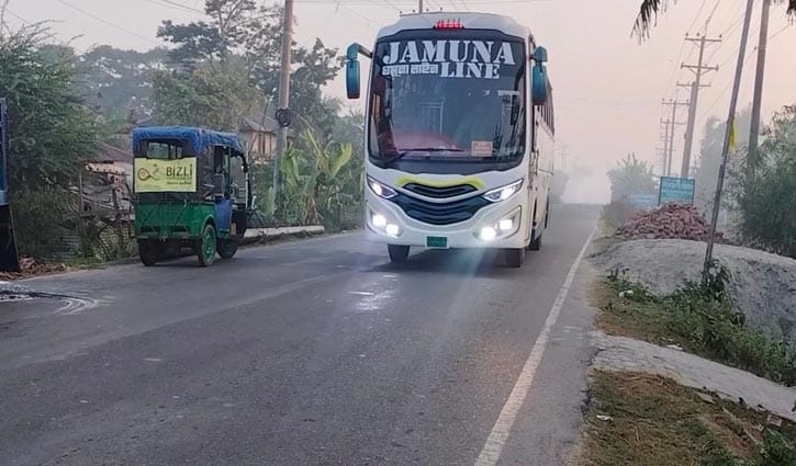 হেডলাইট জ্বালিয়ে চলছে একটি বাস