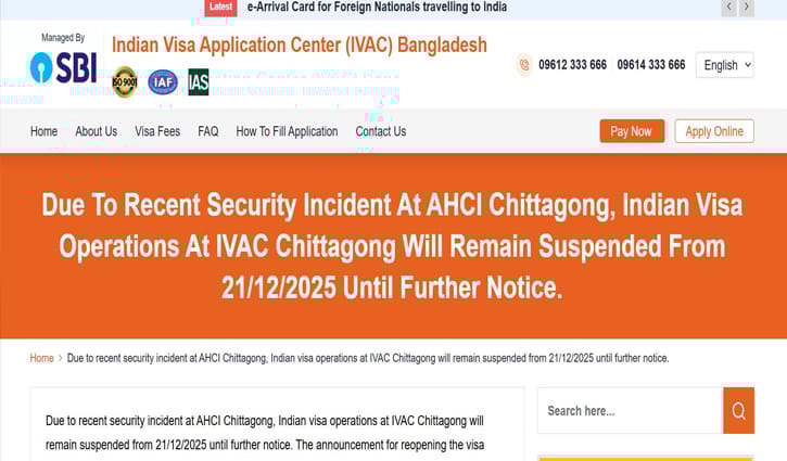ভারতীয় ভিসা আবেদন কেন্দ্র আইভ্যাকের নিজস্ব ওয়েবসাইটে প্রকাশিত এক বিবৃতিতে জানানো হয়েছে, রবিবার (২১ ডিসেম্বর) থেকে পরবর্তী নির্দেশ না দেওয়া পর্যন্ত এ সেন্টারের সব কার্যক্রম স্থগিত থাকবে।