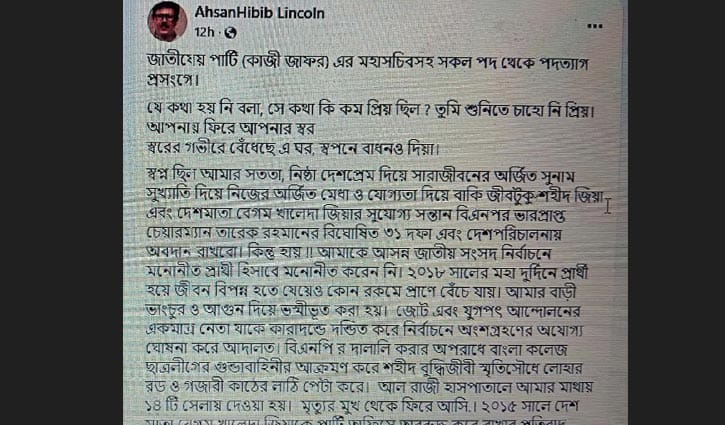 জাতীয় পার্টির (কাজী জাফর) মহাসচিব আহসান হাবীব লিংকন দলটির সব পদ থেকে পদত্যাগের ঘোষণা দিয়েছেন। একই সঙ্গে ত্রয়োদশ জাতীয় সংসদ নির্বাচনে স্বতন্ত্র প্রার্থী হিসেবে অংশ নেবেন বলে জানিয়েছেন।