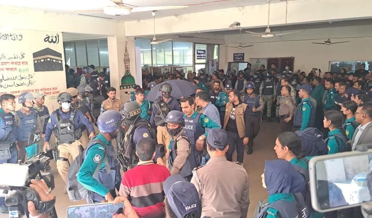 পুলিশের বেষ্টনীর মধ্যে ও মাথা ছাতা দিয়ে ঢেকে আদালতে আনা হয় চিন্ময় কৃষ্ণ দাস ব্রহ্মচারীকে