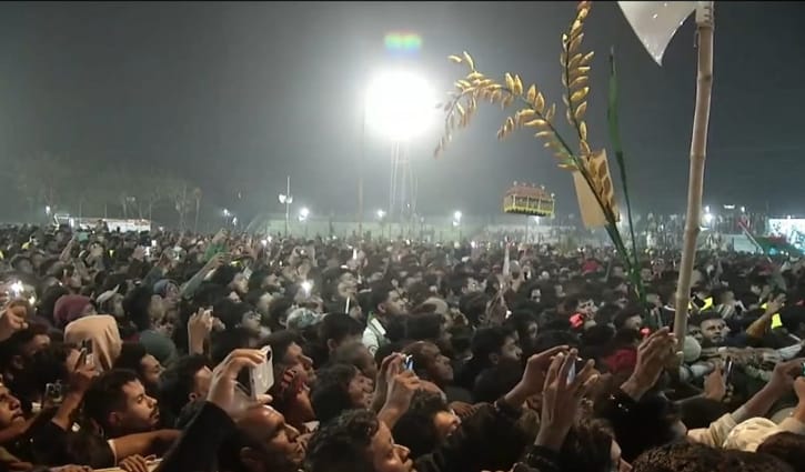 মধ্যরাতে মঞ্চে উঠলেন বিএনপি চেয়ারম্যান তারেক রহমান; তার আগেই জনসভা রূপ নিয়েছে জনসমুদ্রে; ধানের শীষের স্লোগানে রাতের নিস্তবদ্ধতা কেটে তখন মুখর কিশোরগঞ্জের ভৈরবের পৌর স্টেডিয়াম মাঠ, যেন তিল ধারণের ঠাঁই নেই।