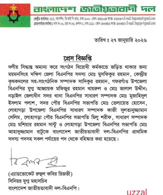 বিজ্ঞপ্তিতে জানানো হয়,সংশ্লিষ্ট সবার অবগতির জন্য জানানো যাচ্ছে যে, সংগঠন বিরোধী কর্মকাণ্ডে জড়িত থাকার জন্য নড়াইল জেলাধীন প্রেস বিজ্ঞপ্তিত উল্লেখিত নেতাদের বাংলাদেশ জাতীয়তাবাদী দল-বিএনপির প্রাথমিক সদস্য পদসহ সব পর্যায়ের পদ থেকে বহিষ্কার করা হয়েছে। এ আদেশ অবিলম্বে কার্যকর হবে।