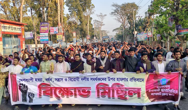 দেশব্যাপী হত্যা, সন্ত্রাস ও বিরোধী দলীয় সমর্থকদের ওপর হামলার প্রতিবাদে বাগেরহাটে বিক্ষোভ মিছিল করেছে ইসলামী ছাত্রশিবির। রবিবার বিকালে শহরের নতুন কোটের সামনে থেকে বিক্ষোভ মিছিলটি শুরু হয়ে শহরের দশানী সার্কিট হাউজের সামনে গিয়ে শেষ হয়।