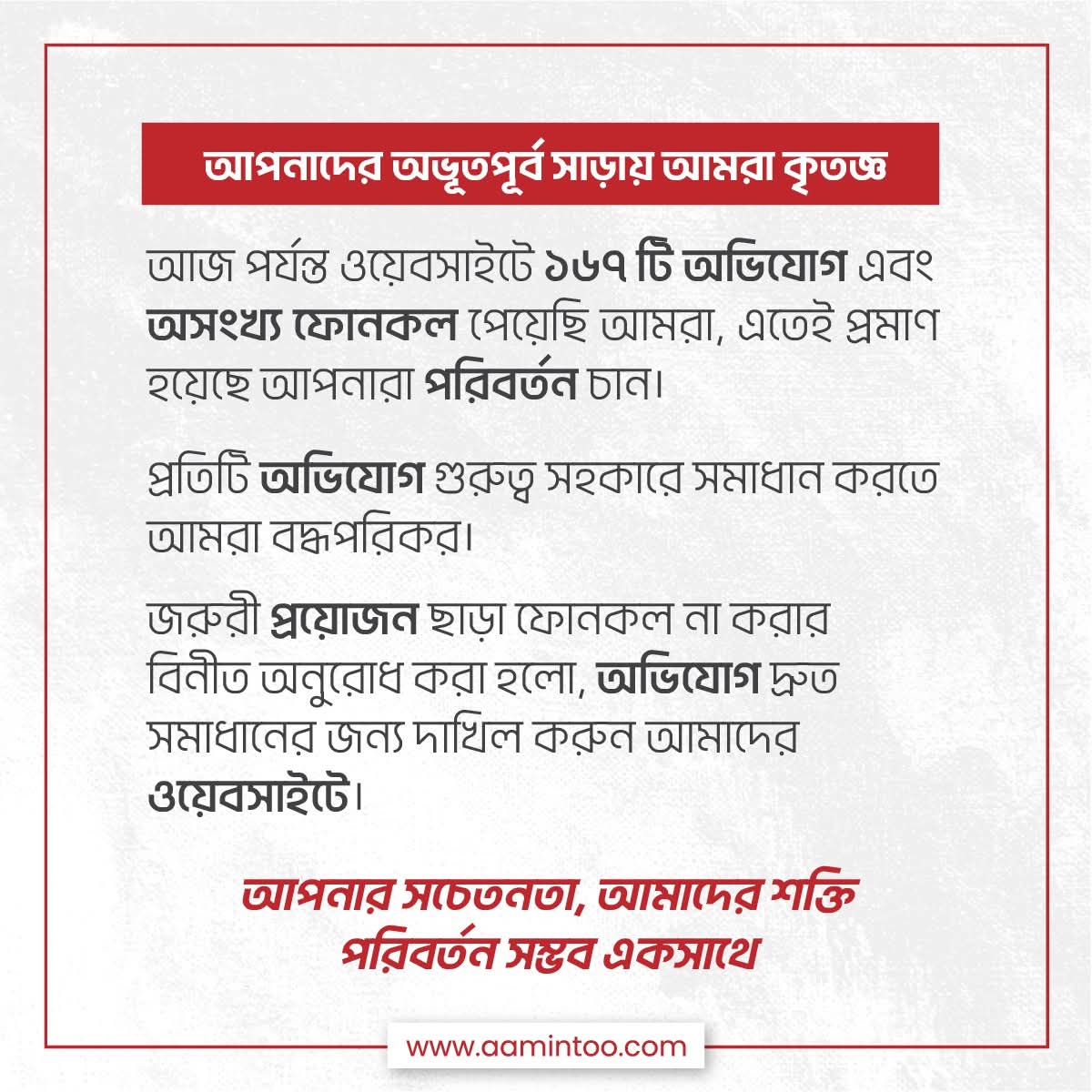 ফেসবুক পোস্টে আবদুল আউয়াল মিন্টু লেখেন, “আজ (মঙ্গলবার) পর্যন্ত ওয়েবসাইটে ১৬৭টি অভিযোগ এবং অসংখ্য ফোনকল পেয়েছি। এতেই প্রমাণ হয়েছে, আপনারা পরিবর্তন চান। প্রতিটি অভিযোগ গুরুত্ব সহকারে সমাধান করতে আমরা বদ্ধপরিকর।”