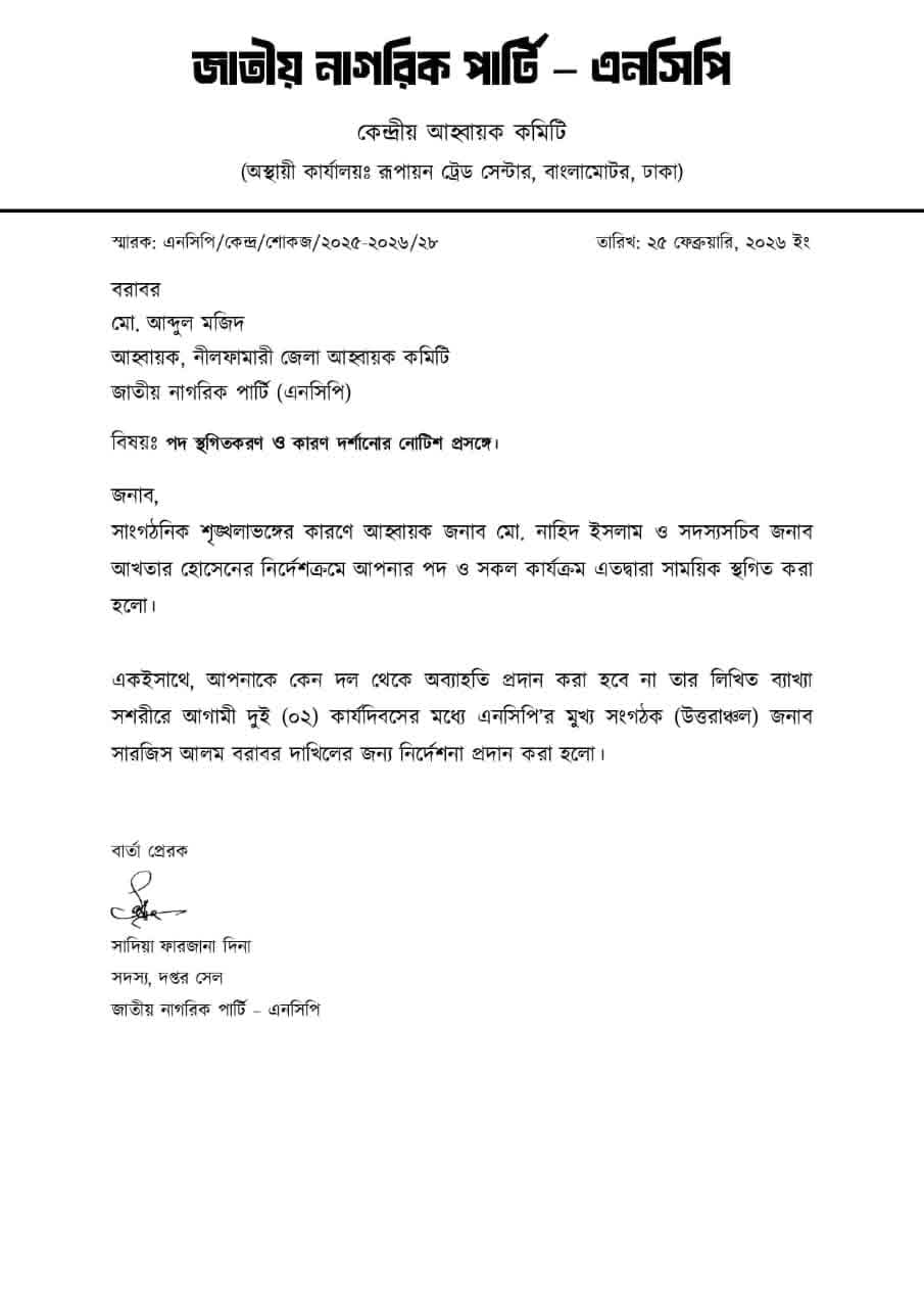 নীলফামারী জেলা এনসিপির আহ্বায়কের পদ স্থগিত