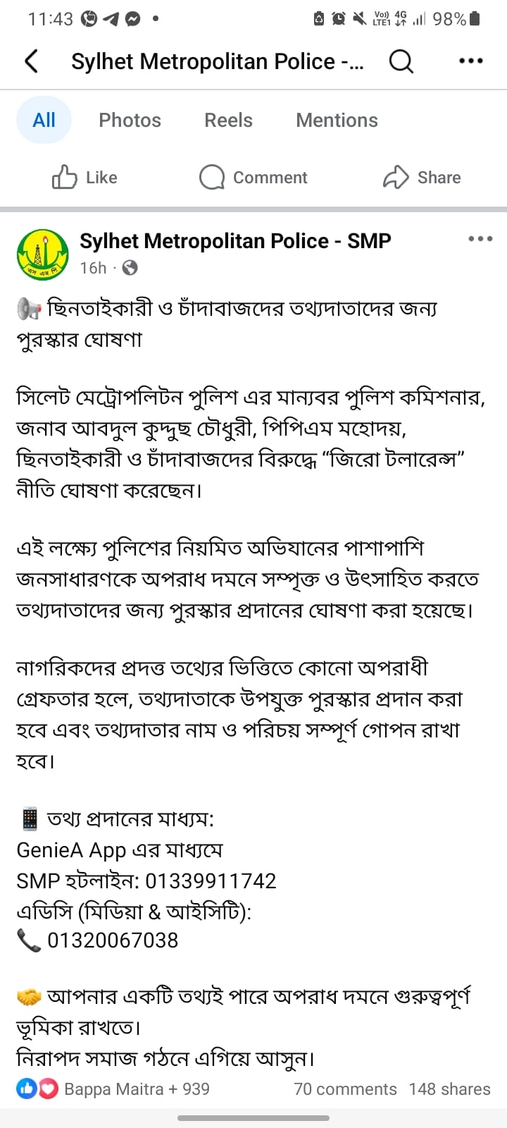 ছিনতাইকারী ও চাঁদাবাজদের তথ্য দিয়ে সহযোগিতা করলে পুরস্কার দেওয়ার ঘোষণা দিয়েছে সিলেট মেট্রোপলিটন পুলিশ (এসএমপি)।