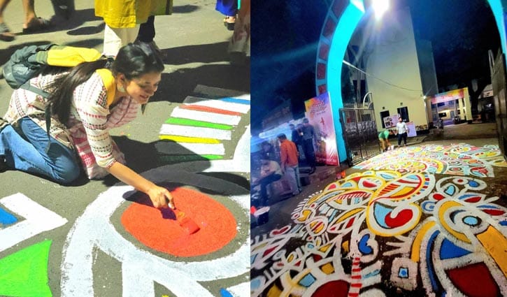 চট্টগ্রামের সড়কে শিক্ষার্থীদের আঁকা আল্পনা।