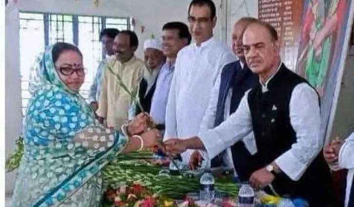 আওয়ামী লীগের প্রেসিডিয়াম সদস্য ফারুক খানের কাছ থেকে ফুলের শুভেচ্ছা নিচ্ছেন সুর্বণা ঠাকুর।