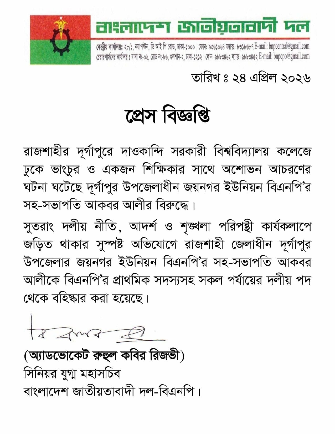 শুক্রবার (২৪ এপ্রিল) বিএনপির সিনিয়র যুগ্ম মহাসচিব অ্যাডভোকেট রুহুল কবির রিজভীর সই করা বিজ্ঞপ্তিতে বহিষ্কারের বিষয়টি জানানো হয়।