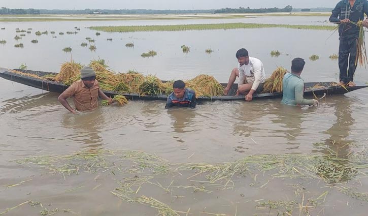 নৌকা নিয়ে বুক সামনে পানিতে দাঁড়িয়ে ধান তুলছেন কয়েকজন কৃষক