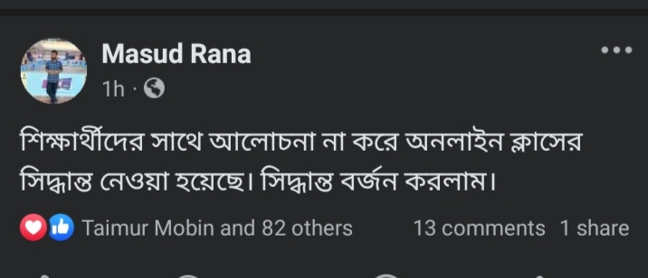 বৈষম্যবিরোধী ছাত্র আন্দোলনের জবি শাখার অন্যতম সমন্বয়ক আলী আহাম্মেদ আরাফ বলেন, বিশ্ববিদ্যালয় প্রশাসনের এই সিদ্ধান্তকে আমরা প্রত্যাখ্যান করছি। সাধারণ শিক্ষার্থীদের সঙ্গে আলোচনা না করে কোনো সিদ্ধান্ত চাপিয়ে দিলেই সেটা আমরা মেনে নিবো না। যখন বিশ্ববিদ্যালয় বন্ধ ঘোষণা করা হয়েছিল, অনেক বিভাগেই পরীক্ষা চলমান ছিল। হুট করে একটা অনলাইন ক্লাসে গেলে বিশৃঙ্খল পরিস্থিতি সৃষ্টি হবে। শিক্ষার্থীরা কেউই অনলাইন ক্লাসে অংশগ্রহণ করবেন না। শিক্ষার্থীদের সঙ্গে প্রশাসনের আলোচনা করার পর ক্লাস-পরীক্ষার বিষয়ে সিদ্ধান্ত নিতে হবে।