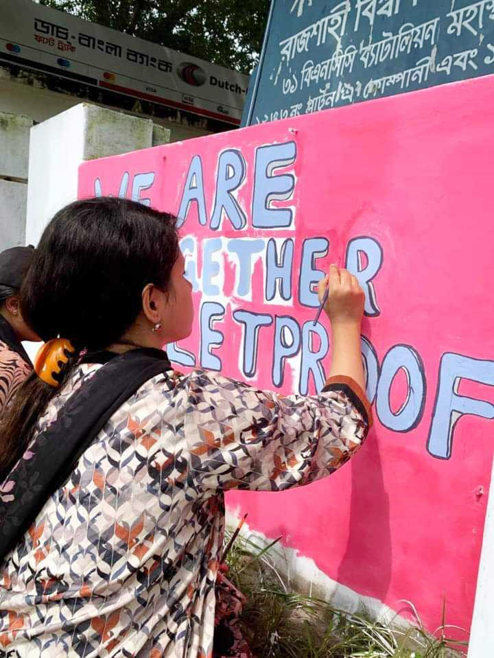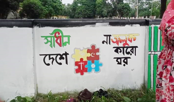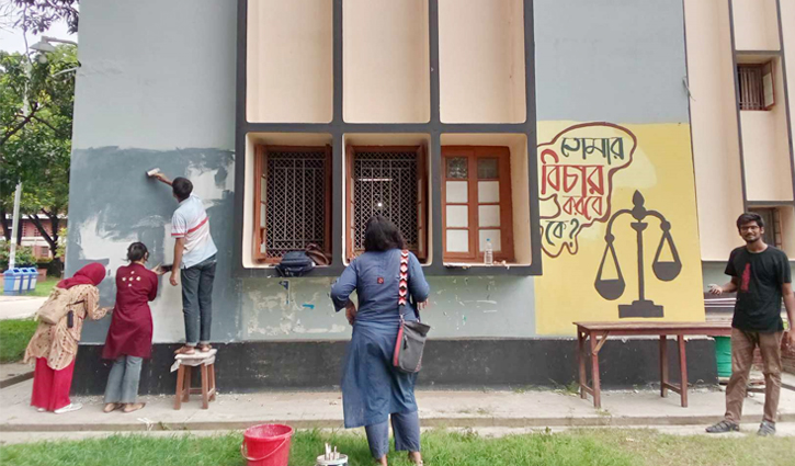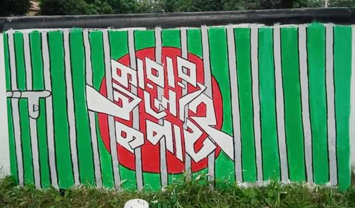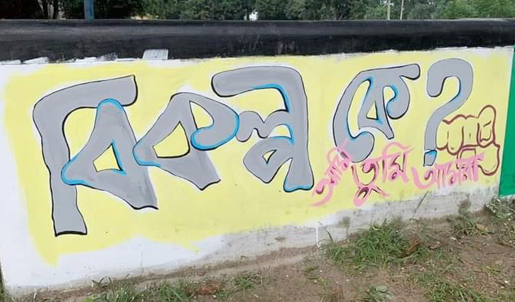 গ্রাফিতিতে ‘সকল ছাত্রকে মুক্ত করুন’, ‘উই আর টুগেদার বুলেটপ্রুফ’, ‘ব্লাডি বাংলাদেশ’, ‘লোহার আলমারি কে?’, ‘আমার স্বাধীন দেশে কারো ঘর যেন না জ্বলে’, ‘বিকল্প কে? আপনি, আমি, আমরা’সহ নানা স্লোগান শোভা পাচ্ছে।