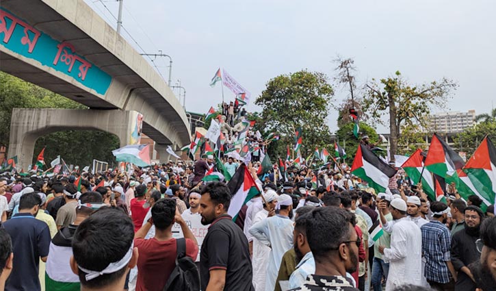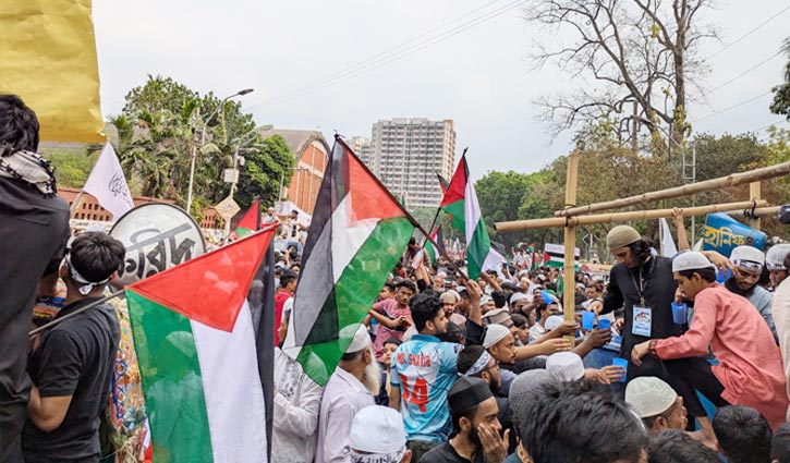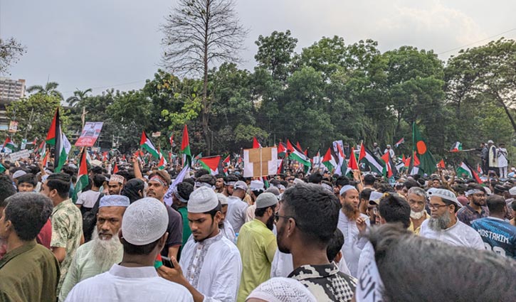সরেজমিনে দেখা গেছে, সকাল থেকেই ছোট-বড় অসংখ্য মিছিল শাহবাগ, দোয়েল চত্বর, মেডিকেল ও নীলক্ষেত মোড় দিয়ে সোহরাওয়ার্দী উদ্যানে প্রবেশ করছে। প্রায় প্রত্যেকের হাতে রয়েছে বাংলাদেশ ও ফিলিস্তিনের পতাকা। অধিকাংশ মানুষ কপালে ফিলিস্তিন বা কালিমার পতাকা বেঁধেছেন। সবার লক্ষ্য সোহরাওয়ার্দী উদ্যান। ঢাকা বিশ্ববিদ্যালয় এলাকা লোকে লোকারণ্য হয়ে আছে। একটু পরপর মানুষ মিছিল নিয়ে ক্যাম্পাস প্রদক্ষিণ করছেন।