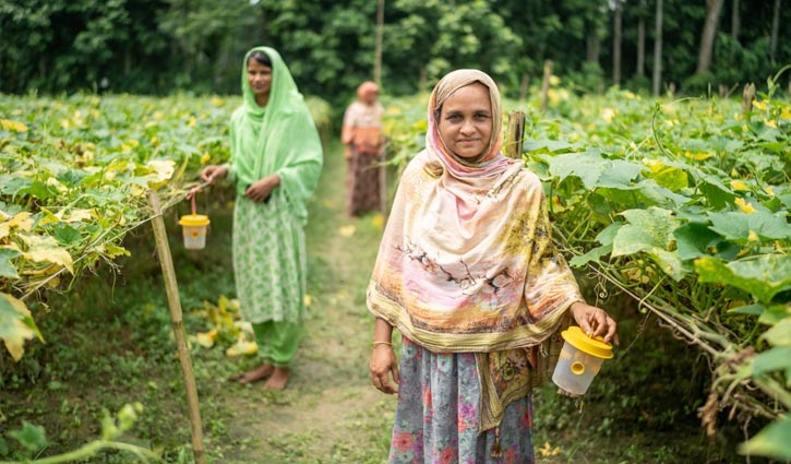 জমিতে ট্রাপ স্থাপন করছে কৃষাণীরা