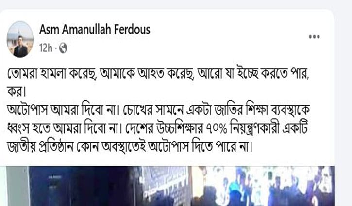 অটোপাসের দাবিতে হামলার শিকার জাতীয় বিশ্ববিদ্যালয়ের উপাচার্য অধ্যাপক এ এস এম আমানুল্লাহ জানিয়েছেন, শিক্ষার্থীরা যা ইচ্ছে করতে পারে কিন্তু কোনোভাবেই তাদের দাবি মেনে নেওয়া হবে না।